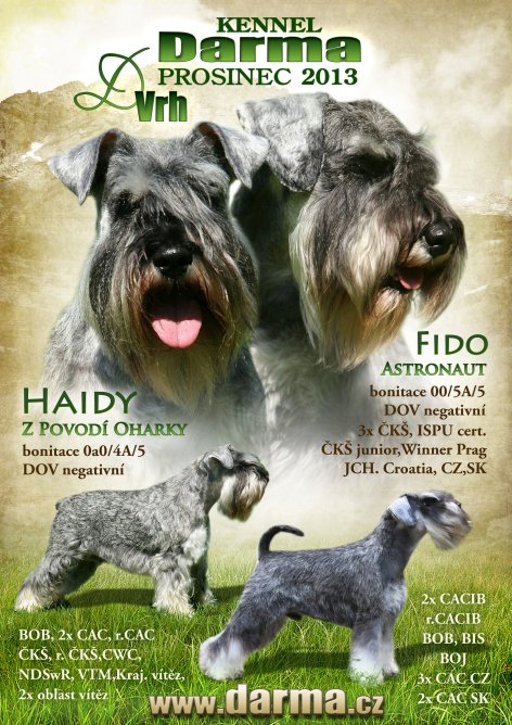 Spojení Fida a Haidy je "rodinné". Oba jsou naši pejsci, takže štěňátka budou vyrůstat v "úplné" rodině s mámou i tátou. Hajda i Fido jsou výstavně velmi úspěšní, zdraví a povahově velmi příjemní pejsci. Mají výbornou kvalitu srsti. Věříme, že štěňátka budou vyrovnanými, příjemnými společníky vaší rodiny a na výstavách budou dobře reprezentovat plemeno.